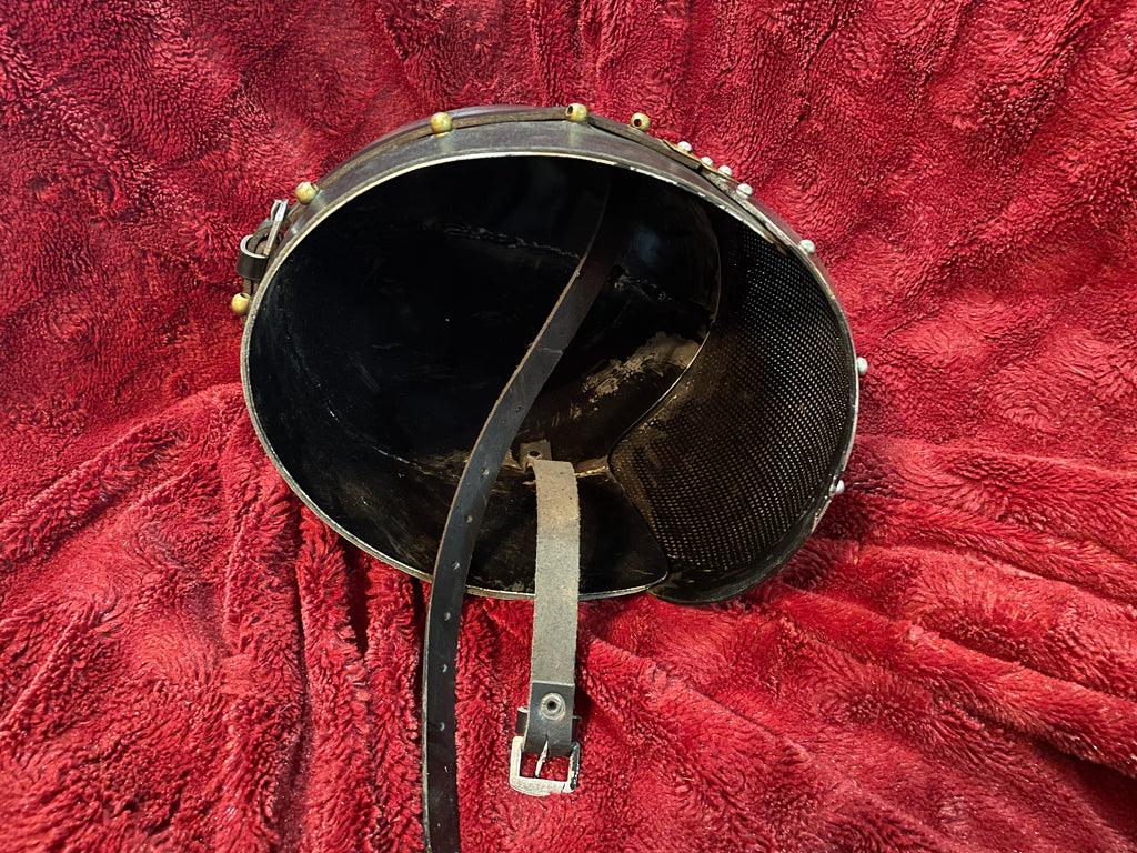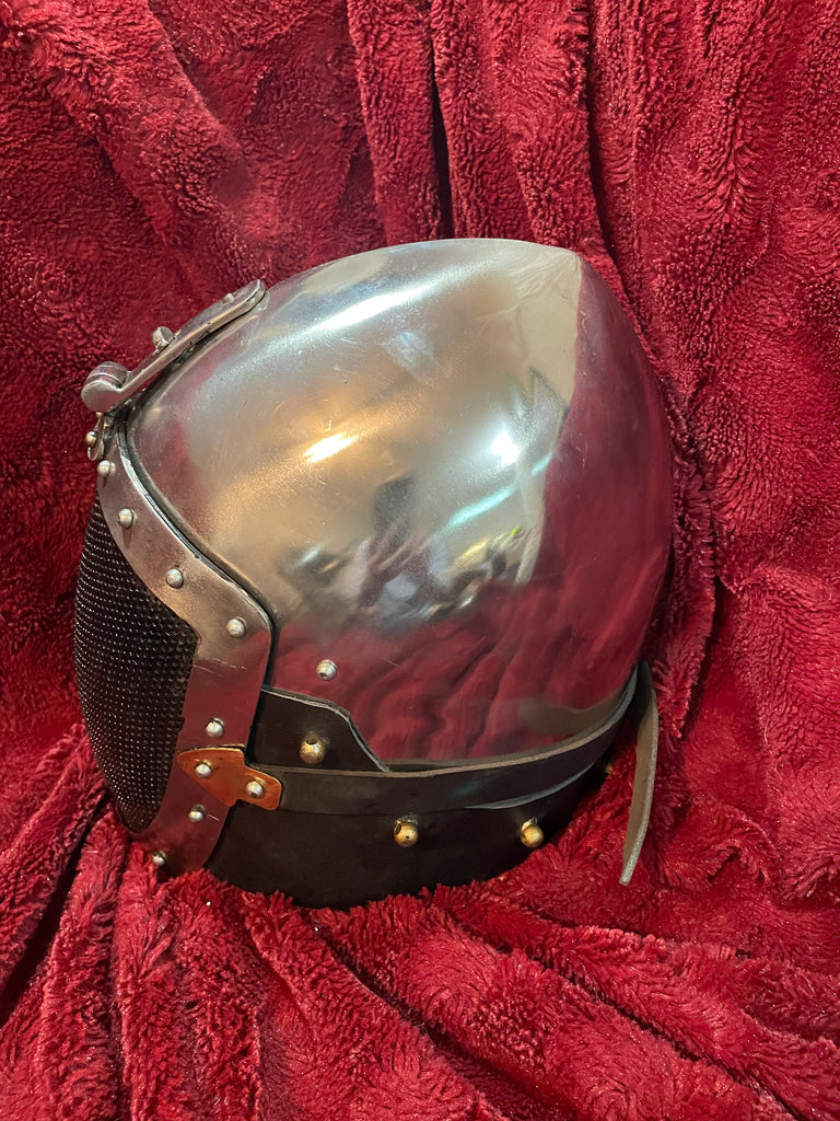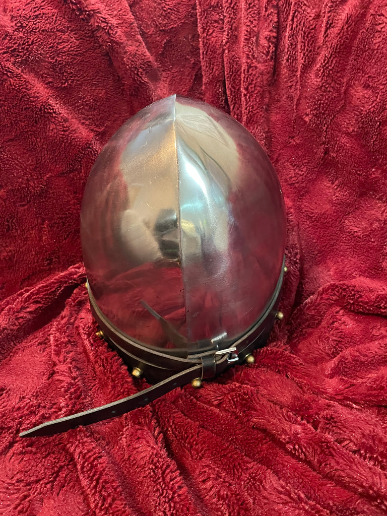 This 18 gauge stainless steel bascinet has the classic lines that you would expect, a center visor, mild steel perf plate painted black for vision contrast as well as solid press vervelles ready for your own cloth or light chain aventail. A leather chin strap is built into the helm, and a piece of self adhesive anti concussion padding is included in the purchase.