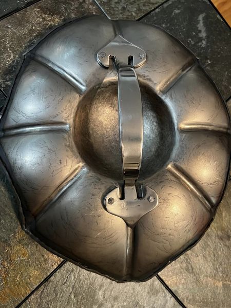 Introducing a Valkyrie Forge exclusive - the Talhoffer Titanium hand buckler! This beautiful period piece is meticulously crafted from titanium sheet, fluted and edged in period style. It is shined to a high polish, and feather light, yet rugged enough for any fencing or heavy application. It sports a solid 1/4” thick sturdy handle with a weight of only 1.2 lbs, or just over 1/2kg!! This is a fine addition to your kit - attractive, durable and light!
