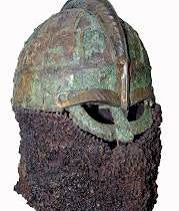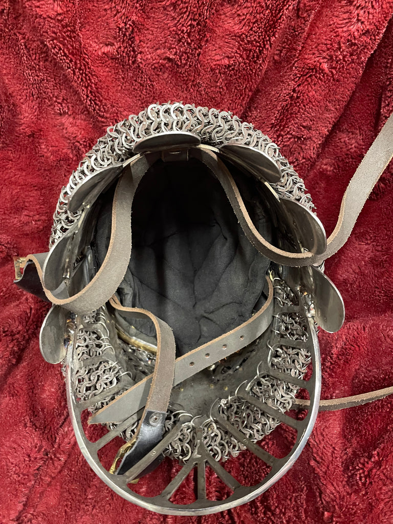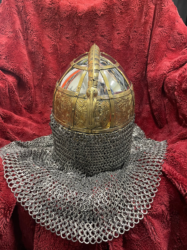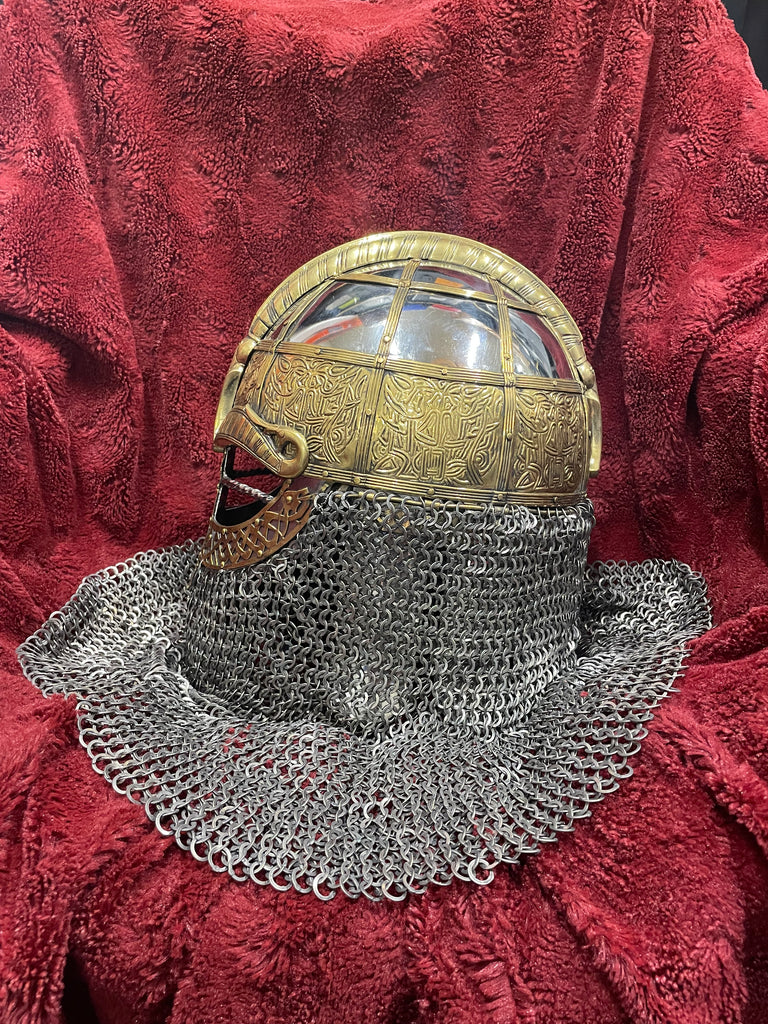 This dark age, proto-Viking age Valsgard 8 helm has been adapted for modern rattan combat. It is 14 gauge stainless steel and has brass cast fittings, meticulously chased brass plates, stainless riveted maile, a liner and a chinstrap. This is a legacy level helmet for any serious early period fighter. There is a picture included of the period excavation helmet for comparison.